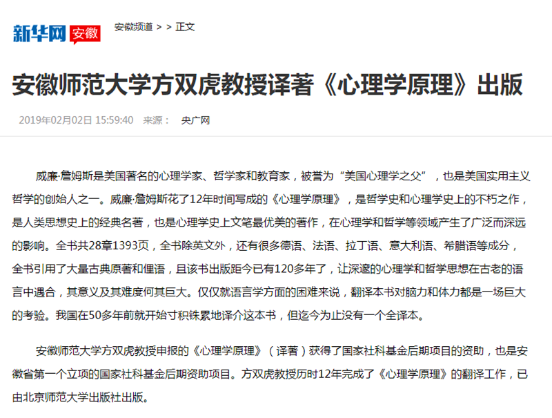 威廉·詹姆斯是美国著名的心理学家、哲学家和教育家,被誉为“美国心理学之父”,也是美国实用主义哲学的创始人之一。威廉·詹姆斯花了12年时间写成的《心理学原理》,是哲学史和心理学史上的不朽之作,是人类思想史上的经典名著,也是心理学史上文笔最优美的著作,在心理学和哲学等领域产生了广泛而深远的影响。全书共28章1393页,全书除英文外,还有很多德语、法语、拉丁语、意大利语、希腊语等成分,全书引用了大量古典原著和俚语,且该书出版距今已有120多年了,让深邃的心理学和哲学思想在古老的语言中遇合,其意义及其难度何其巨大。仅仅就语言学方面的困难来说,翻译本书对脑力和体力都是一场巨大的考验,甚至称得上是为了嘉惠学界而投身于“炼狱”之中。我国在50多年前就开始寸积铢累地译介这本书,但迄今为止没有一个全译本,最多的是田平先生翻译了其中13章,可见难度之大。安徽师范大学方双虎教授申报的《心理学原理》(译著)获得了国家社科基金后期项目的资助,也是安徽省第一个立项的国家社科基金后期资助项目。方双虎教授历时12年完成了《心理学原理》的翻译工作,已由北京师范大学出版社出版。