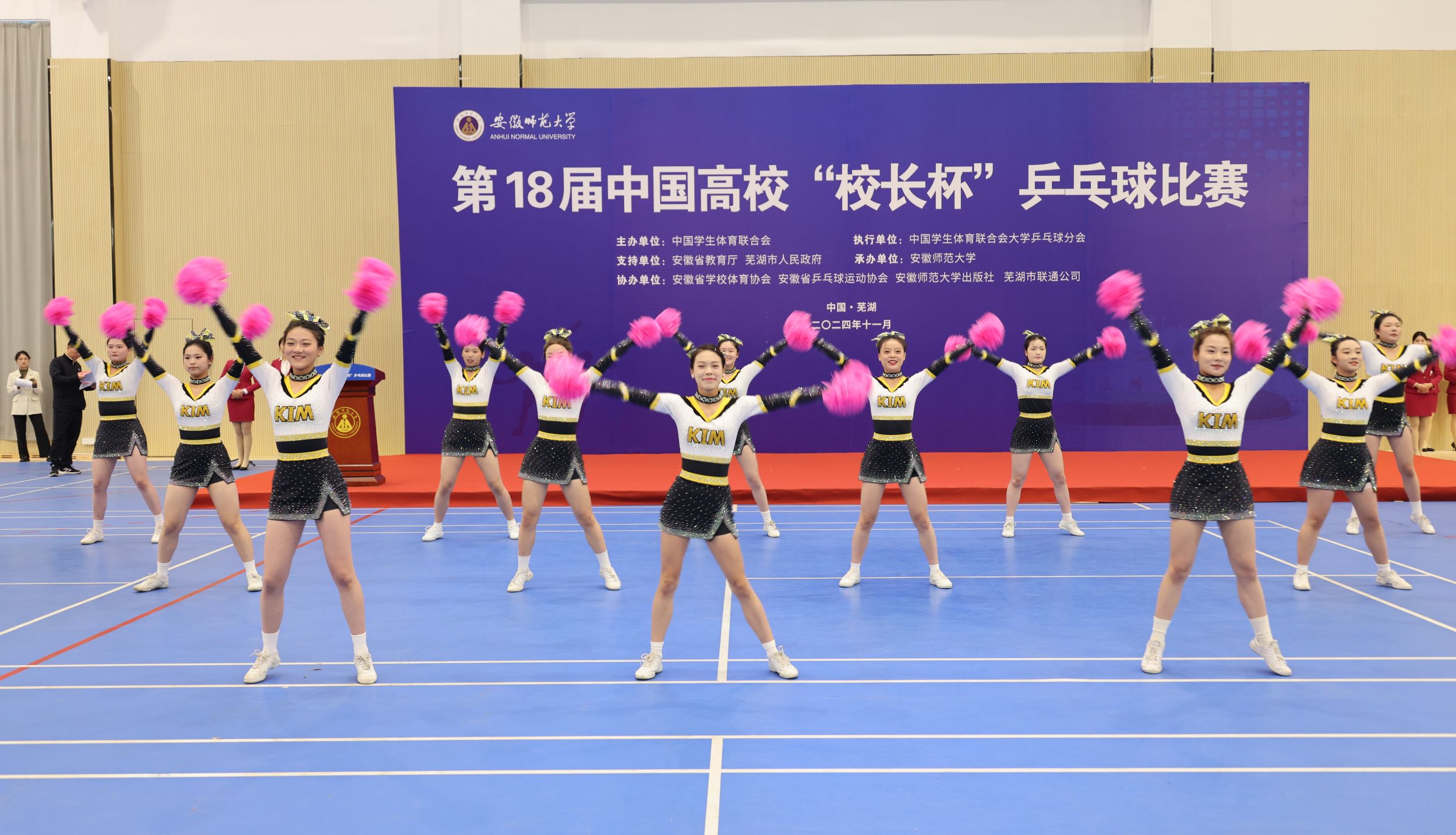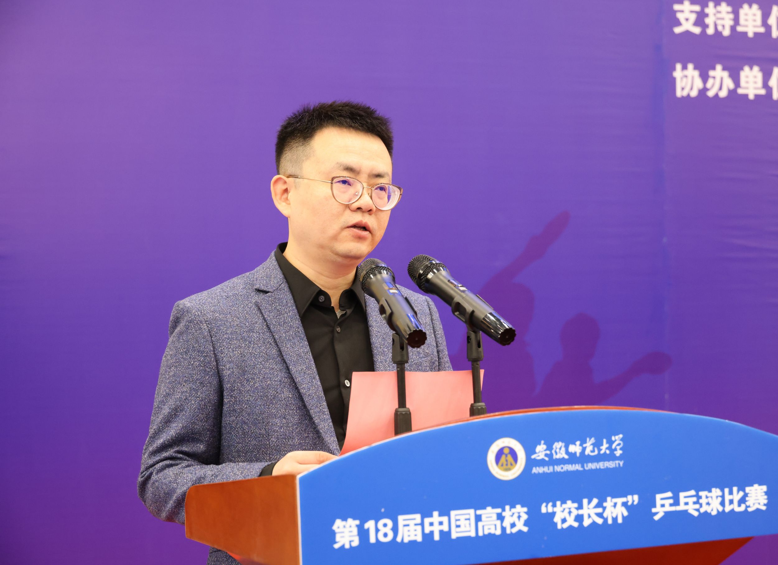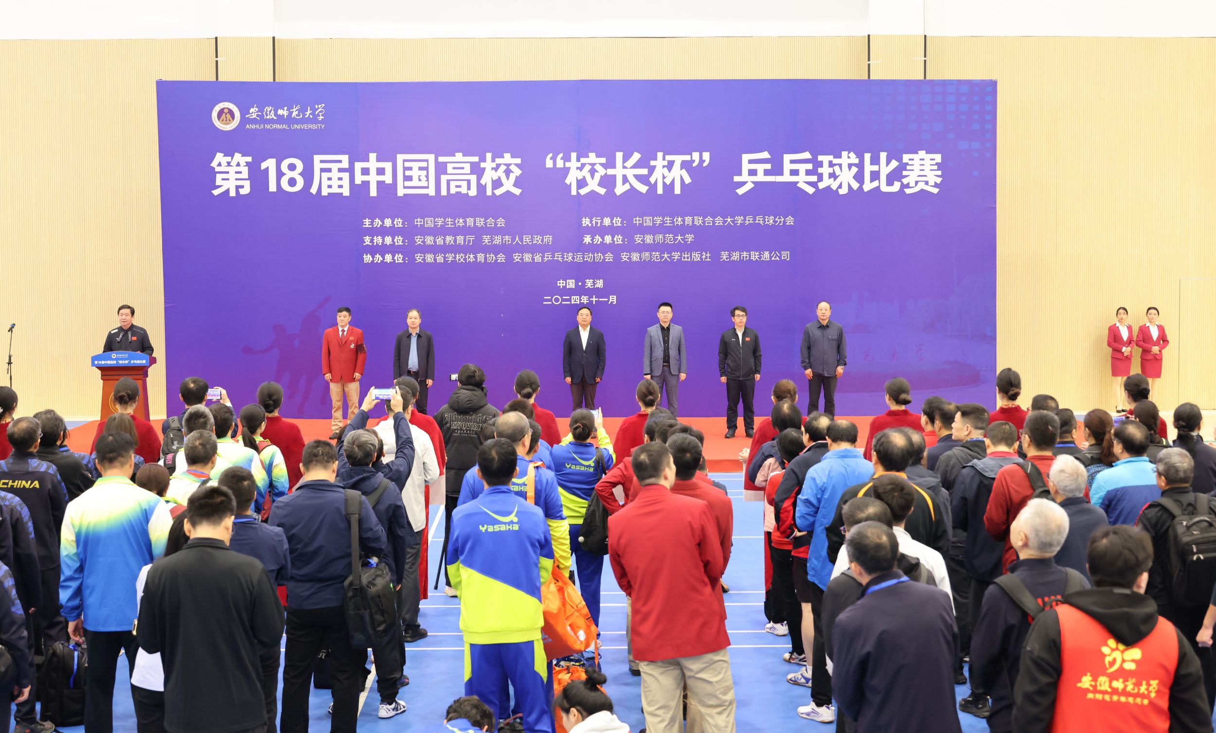 11月2日上午,由中国学生体育联合会主办,中国学生体育联合会大学乒乓球分会执行,安徽省教育厅、芜湖市人民政府支持,安徽师范大学承办,安徽省学校体育协会、安徽省乒乓球运动协会、安徽师范大学出版社、中国联通芜湖分公司协办的第18届中国高校“校长杯”乒乓球比赛在我校球类训练馆隆重开幕。中国学生体育联合会副主席刘宝平,安徽师范大学党委副书记、常务副校长熊宇杰,安徽师范大学党委副书记胡靖,中国学生体育联合会理事、上海交通大学体育系党委书记龚强,安徽省教育厅体卫艺处处长葛德连,中国学生体育联合会常务理事、赛事监督李昌军,东南大学体育系主任、比赛裁判长蔡晓波出席开幕式。来自全国16个省份(自治区、直辖市)的200余名领队、教练、运动员、裁判员参加开幕式。开幕式由胡靖主持。