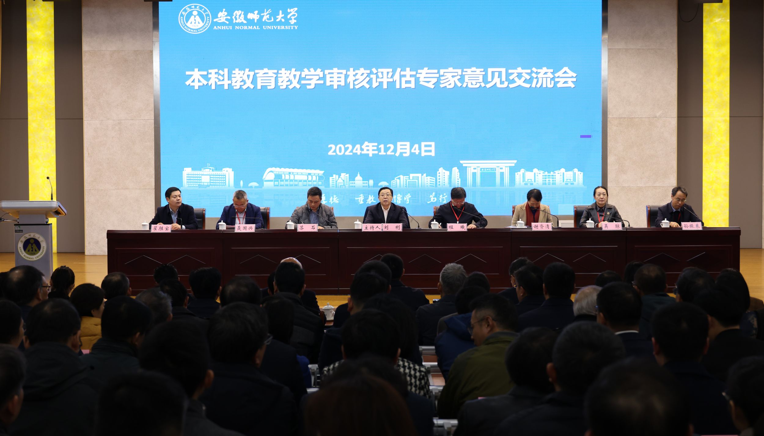 12月4日上午,学校在实习实训中心一楼报告厅召开本科教育教学审核评估专家意见交流会,专家组组长、北京语言大学原校长刘利,专家组副组长、阜阳师范大学党委书记程曦,专家组成员湖南师范大学副校长谢资清、河南师范大学副校长聂国兴、安庆师范大学副校长吴琼、淮北师范大学副校长翟胜宝、西南大学劳动教育研究院院长孙振东及专家组项目管理员、秘书,安徽省教育厅高教处副处长苏石,全体在校校领导出席会议。学校各部门主要负责人,校督导团成员,各学院党委书记、院长、党委副书记、教学副院长、学术分委员会主任、专业负责人、本科教学实验中心负责人、教师代表、本科生辅导员代表、学生代表参加会议。会议由刘利主持。