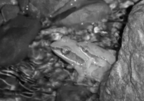 图1 左:正在求偶鸣叫的雄性凹耳蛙,右:夜晚在山溪激流中抱对的凹耳蛙