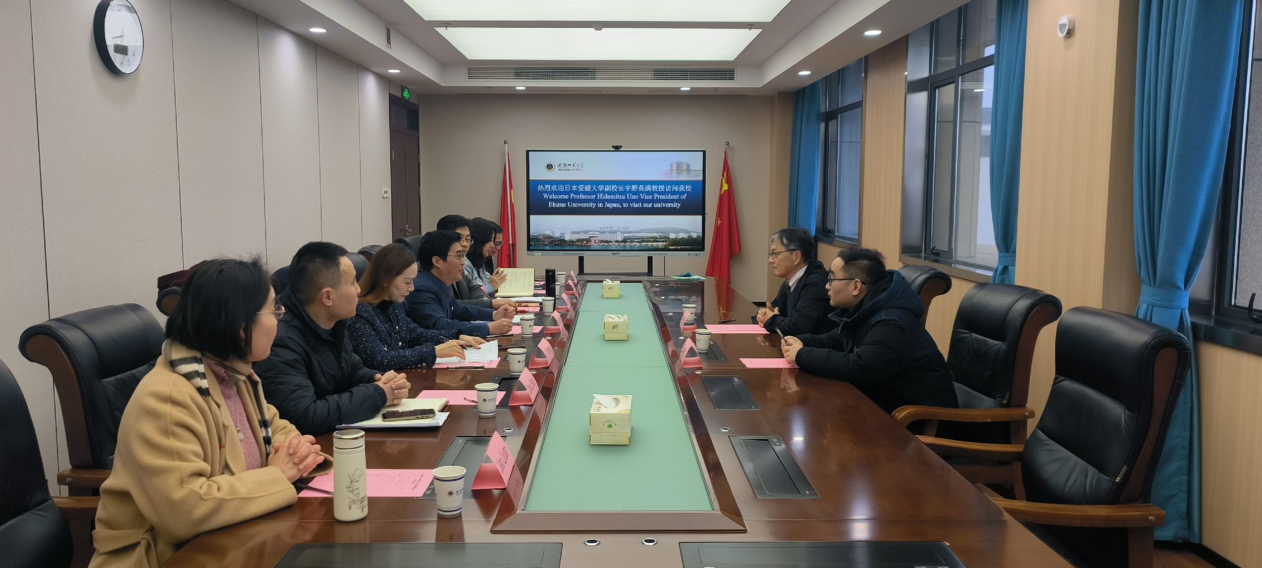 宇野英满对我校的热情接待表示感谢,并介绍了日本爱媛大学办学整体情况及学科优势。他指出安徽师范大学办学历史悠久,特色鲜明,两校合作优势明显,具有较强的互补性和广泛的合作空间;他表示非常赞同并支持两校提出的合作愿景,希望能尽快共同推动合作项目落地实施。