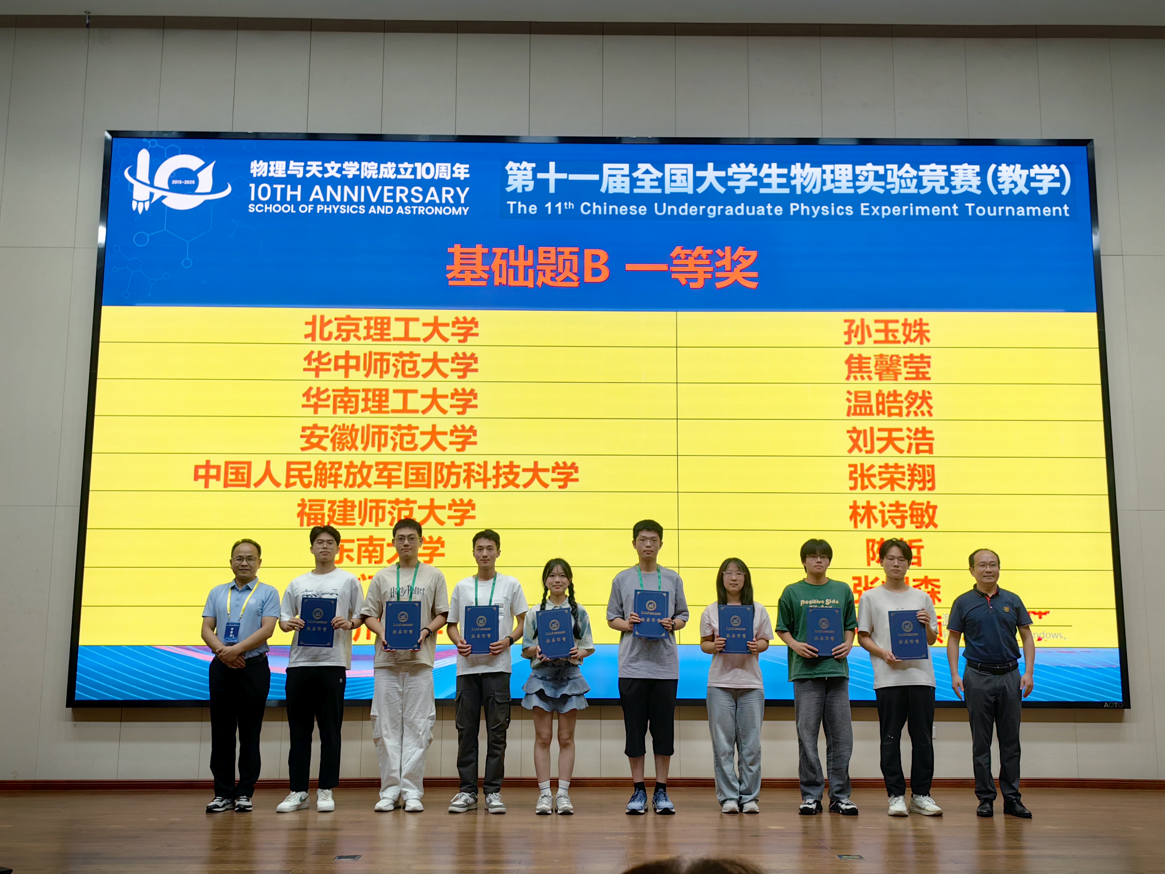 近日, 2025年全国大学生物理实验竞赛(教学)在中山大学广州校区南校园和珠海校区落下帷幕。2023级物理学(师范)专业本科生陶润择、刘天浩同学分别斩获基础题A、B组别的一等奖(最高奖),学校荣获优秀组织奖。这是我校首次组织学生参加该赛事的“教学”赛道,并取得了全省前列的优异成绩。