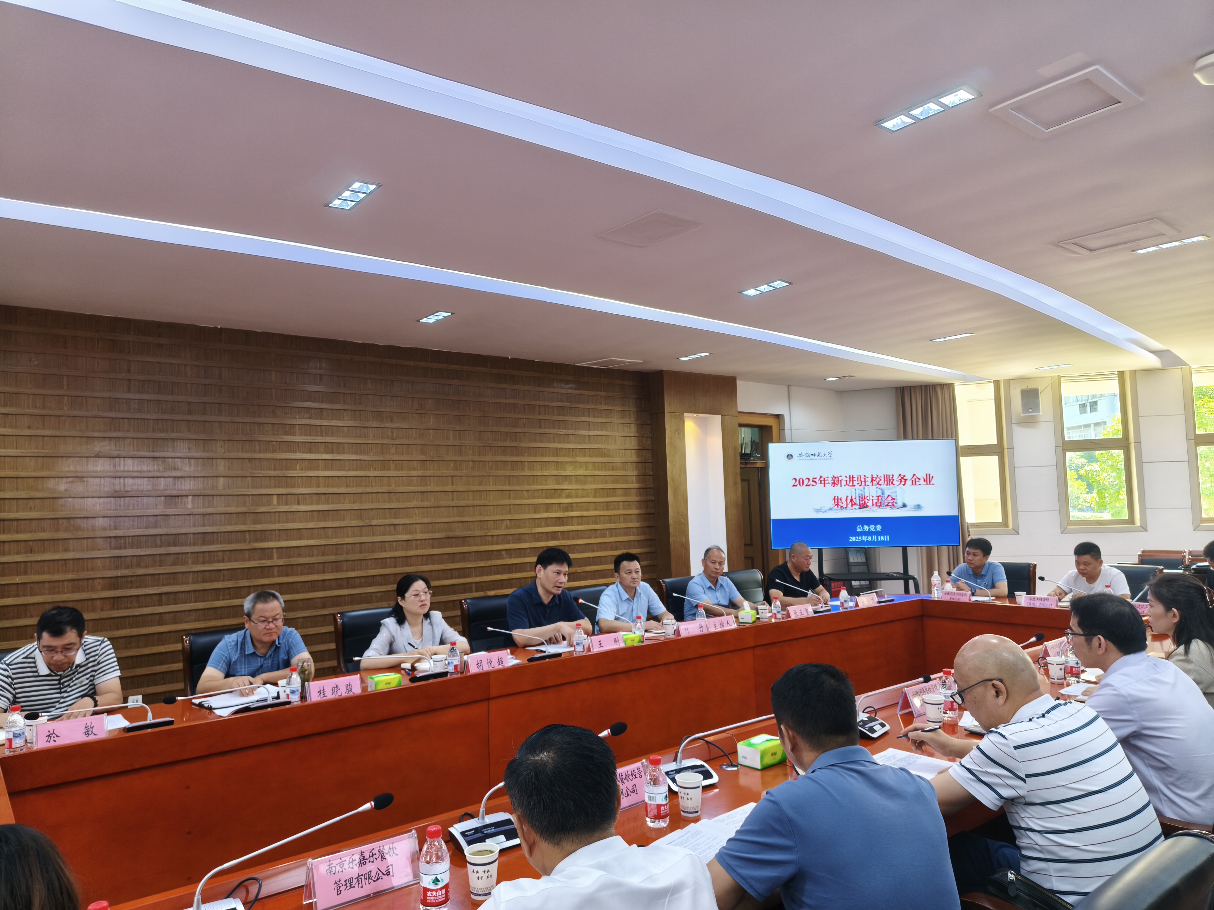 8月18日上午,学校召开 2025 年新进驻校服务企业集体谈话会。校党委常委、副校长王刚,总务处班子和各中心负责人,以及15家企业法人代表和项目经理参加会议。会议由总务党委书记叶丹主持。