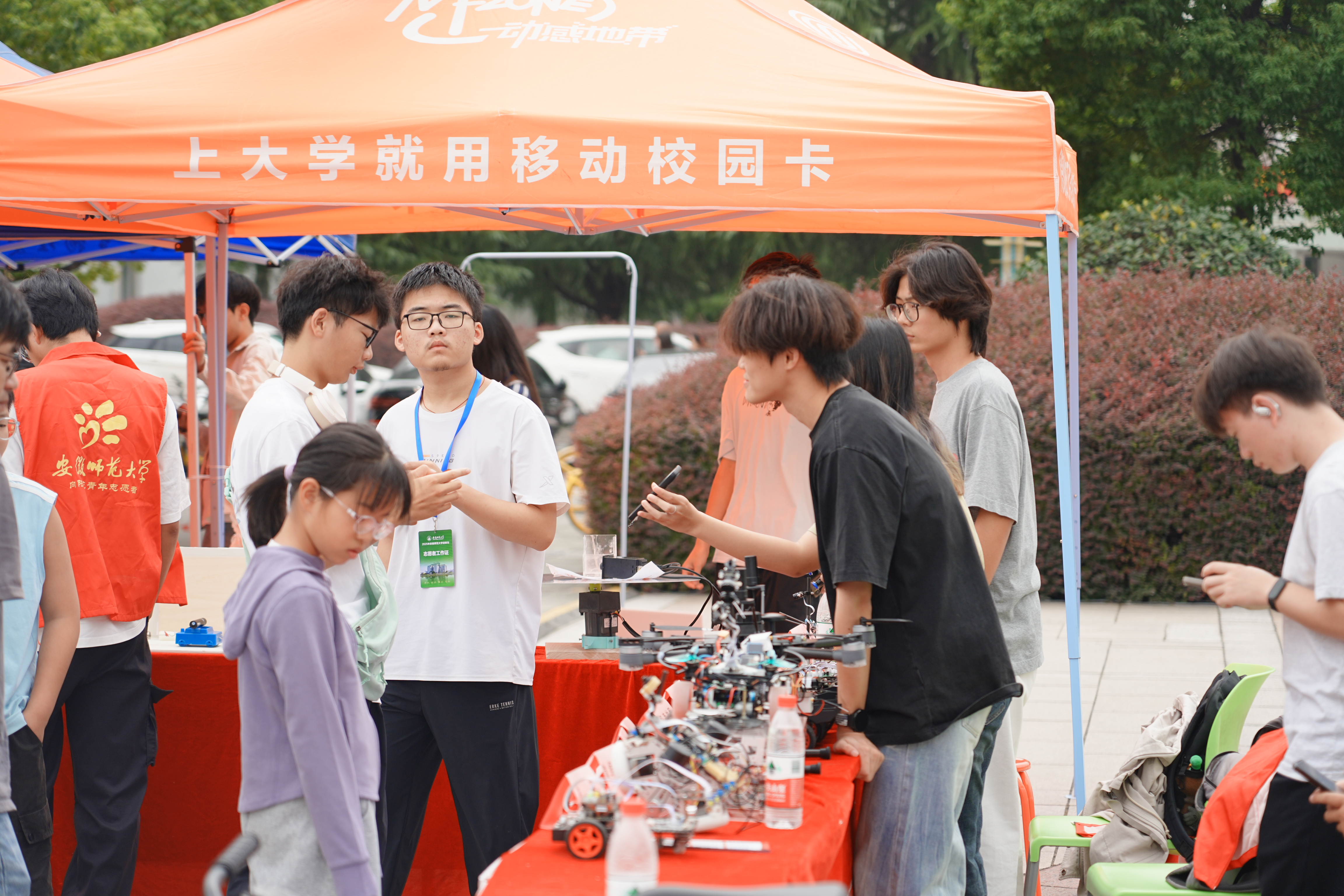 多个理科学院推出专业实物展台,成为迎新亮点。计算机与信息学院现场演示无人机快递配送与机器人互动。2023级物联网工程专业张雨介绍:“这类无人机的主要功能是送快递——依托AI算法规划最优路径,可自动避障、精准投递”;生命科学学院推出生物标本展示区,扬子鳄、中华鲟等一批国家保护动物标本吸引众多新生驻足交流。2023级生物技术专业余斐表示:“新生和家长一看过来,就能明白生命与科学学院的专业方向,不少新同学还会凑过来问我标本是怎么来的、背后有什么科学知识——这些标本能直观呈现专业特色,激发新同学的学习兴趣。”
