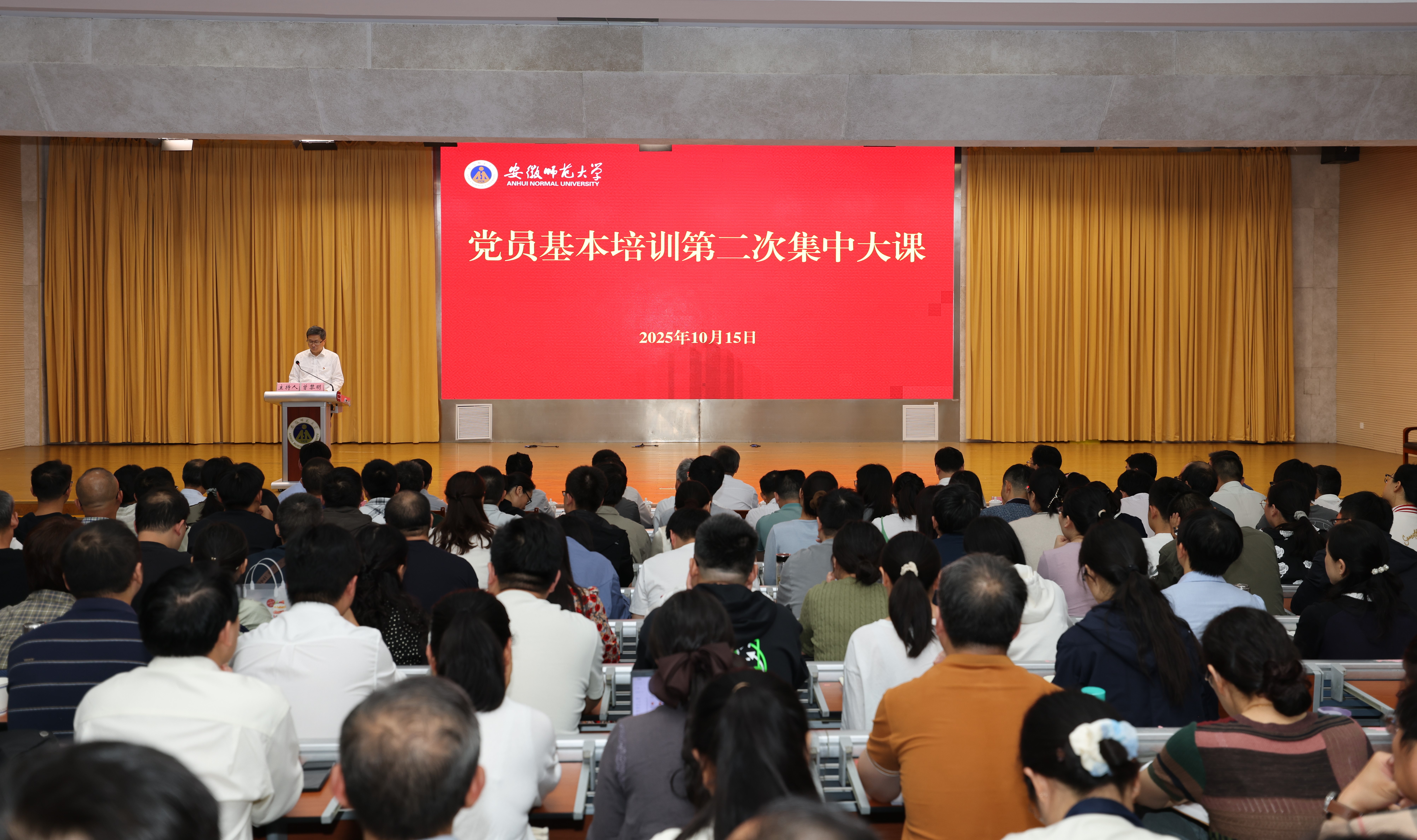 10月15日,学校举行2025年党员基本培训第二次集中大课,全校5200余名党员在三个校区通过1个主课堂、41个分课堂同上一堂课,集体收看学习由教育部党组书记、部长怀进鹏主讲的“深入学习贯彻习近平总书记关于教育的重要论述 以教育强国支撑引领中国式现代化”专题视频辅导报告。省委教育工委派员到会指导。安徽工程大学、皖南医学院、芜湖职业技术大学、安徽信息工程学院、芜湖学院等高校党委组织部(党校)负责同志到场观摩。校党委副书记曾黎明主持集中大课并作动员讲话。
