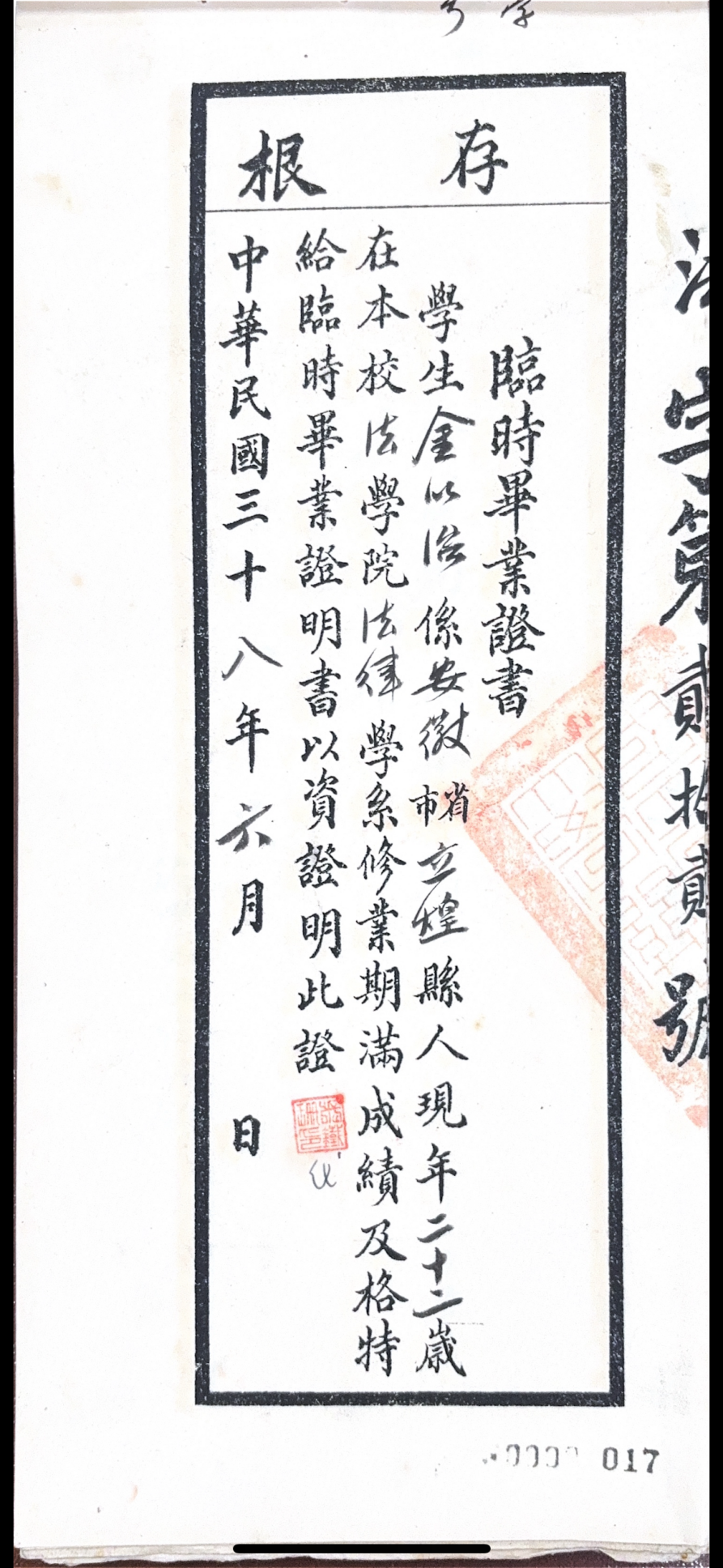 1945年,金平教授考上了成立于抗战中的安徽学院。1946年,因战争停办的省立安徽大学(安徽师范大学前身)复校,更名为国立安徽大学,金平教授于此就读法律系,从此结缘法律70余载。
