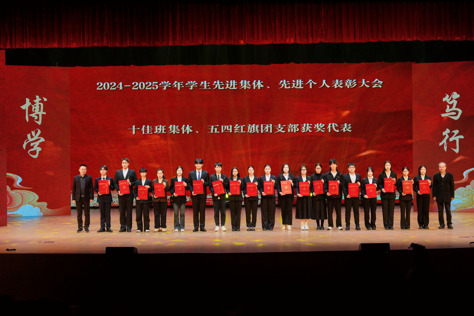 整场表彰大会将颁奖表彰、现场访谈和文艺节目穿插进行,依次对2024-2025学年获得三好学生标兵、优秀学生干部标兵、三好学生、优秀学生干部、单项奖、优秀研究生、优秀研究生干部、十佳大学生标兵、自强之星和十佳青年志愿者等综合类先进个人;AB类国家级奖项、本科生国家奖学金、励志奖学金、研究生国家奖学金等学习类先进个人;优秀学生会、十佳事迹、“行走的思政课”暑期社会实践优秀团队、十佳社团、十佳班集体、五四红旗团支部等先进集体进行表彰。大会通过颁奖词宣读,对受表彰的先进个人和集体给予了高度评价,生动呈现了他们携手同行、共同成长的青春历程。