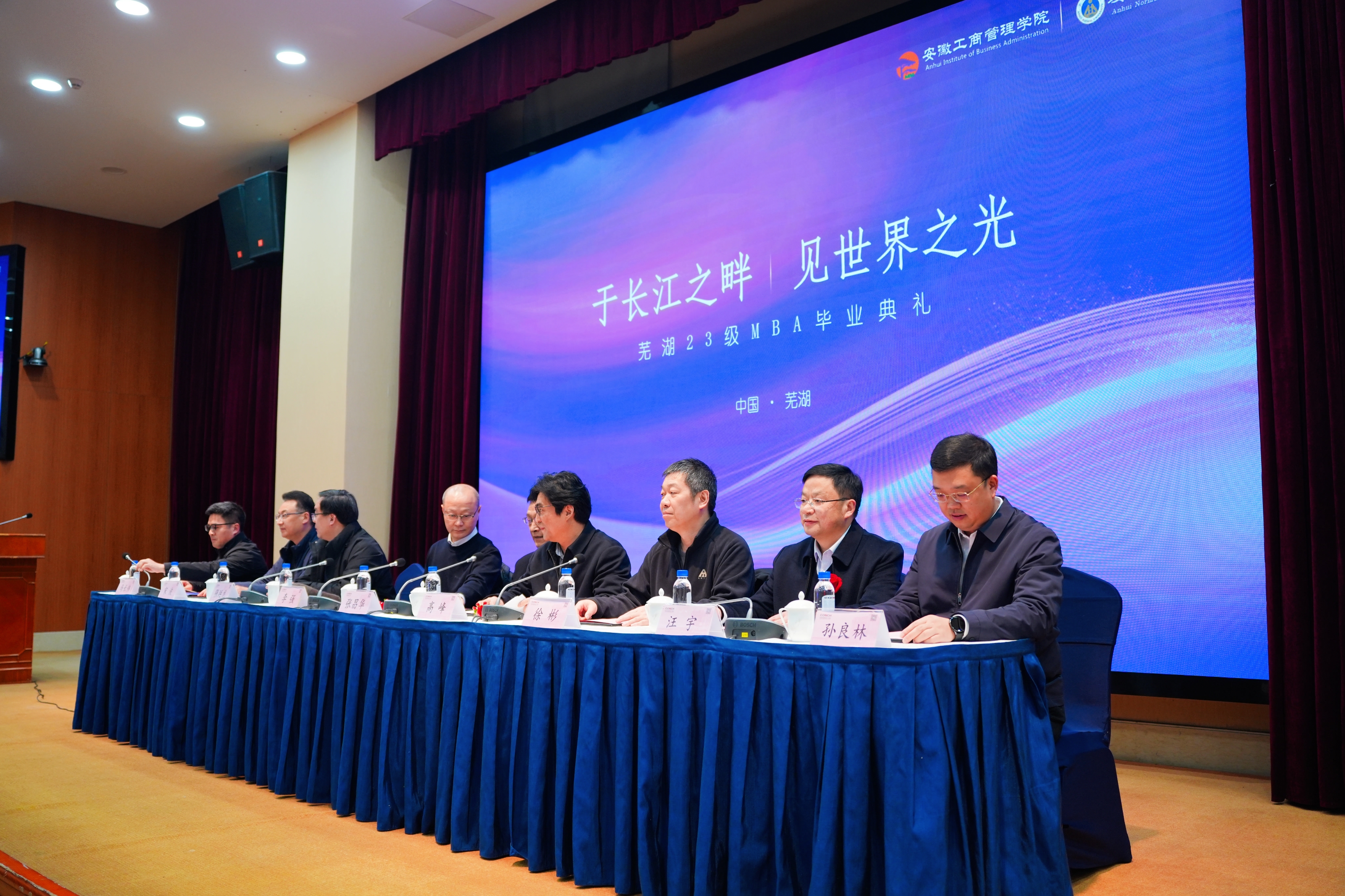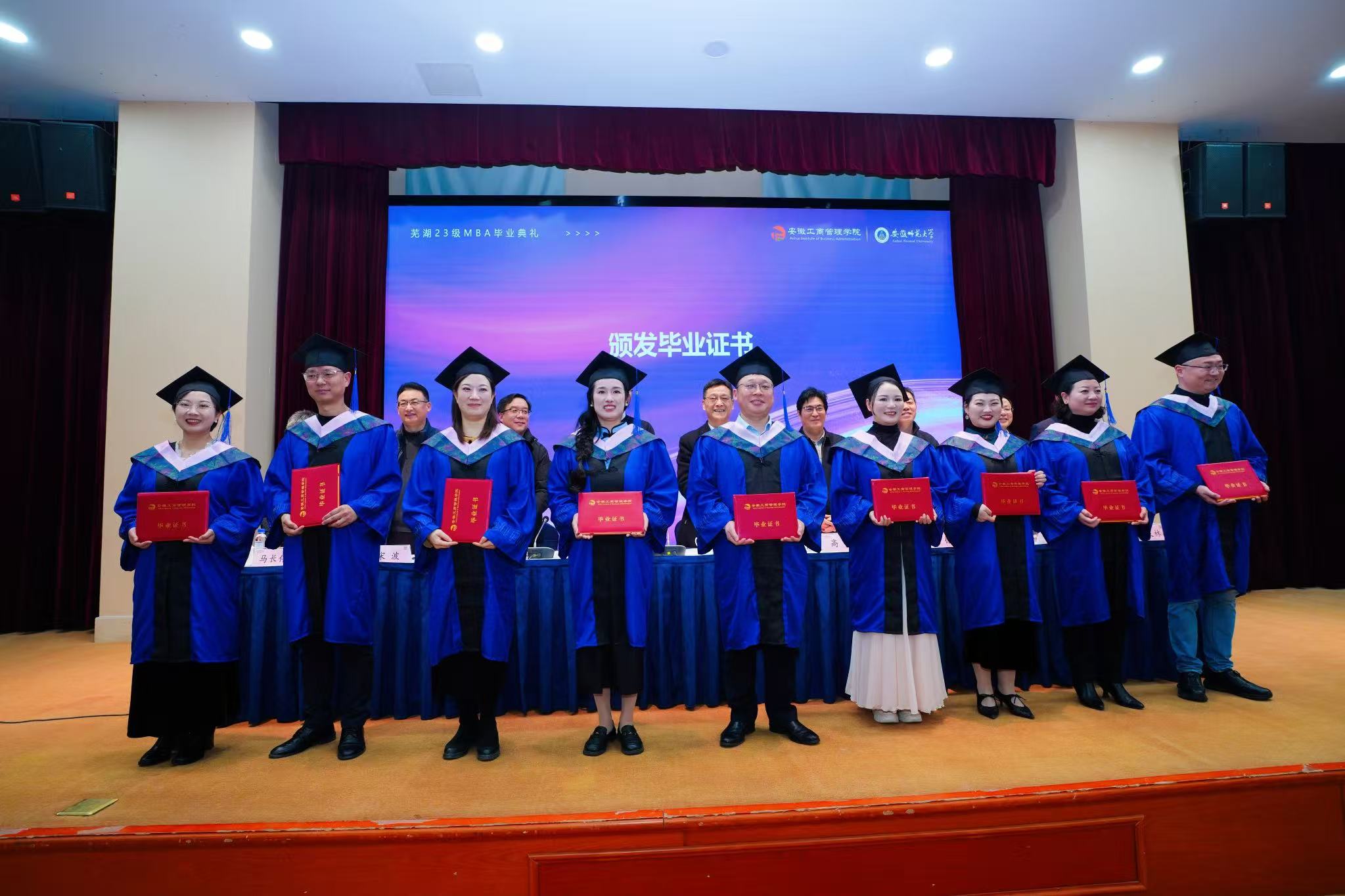 1月11日,我校和安徽工商管理学院共同举办联合培养2023级MBA学生毕业典礼暨校友联络员聘任仪式,安徽省委教育工委、省教育厅一级巡视员张昌华,安徽师范大学党委常委、副校长高峰,安徽工商管理学院副院长李强,芜湖企业家联合会执行会长汪宇等校友代表,我校相关部门、经济管理学院负责同志及教师代表和2023级联合培养MBA全体毕业生参加典礼仪式。经济管理学院院长马长伟主持典礼仪式。