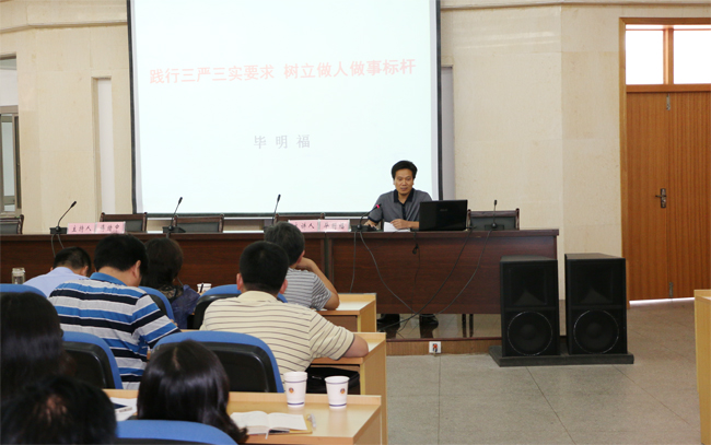 本网讯(文/赵 栋 图/蔡 伟)7月13日,校党委常委、副校长毕明福为分管联系的保卫处、后管处、基建处、校医院和法学院、教科学院、国旅学院等单位科级以上干部和教师党员代表,作《践行“三严三实”要求,树立做人做事标杆》专题教育党课。党课报告由后管处处长傅绪中主持。