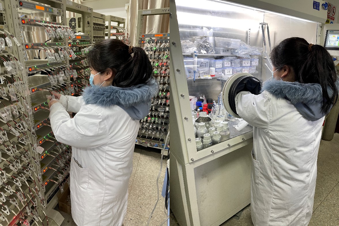 疫情的三年,她积极配合疫情防控防控工作,积极参加学院疫情防控志愿工作。研一期间,她勤勤恳恳学习专业课程,不断丰富自己的理论基础,不断提高自身科研能力以及电池方向专业水平,并且主动学习各种测试分析仪器使用方式以及规范作图方法。她吃苦耐劳、慎思笃行,为探索实验方案的可行性,且在科研上她具有计划性,合理安排自己的时间,不论严寒酷暑,每天坚持在实验室测试分析,直至实验室关门,研究生在读期间组装电池共计八百多块(图二)。2022年7月份,她做完根尖囊肿手术不到一周,便主动回到实验室继续完成论文。2023年1月份疫情封控,新冠感染在家中隔离期间,她仍然钻研科研论文撰写。她的付出像极了古语描述的“故天将降大任于斯人也,必先苦其心志,劳其筋骨,饿其体肤,空乏其身,行拂乱其所为,所以动心忍性,曾益其所不能。”