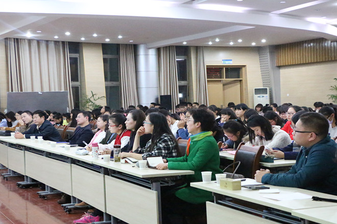 本网讯 (文学院 文/王月亭 刘珍珍 图/宁文静 张恒) 11月15日晚,文学院“与作家面对面”系列讲座第八期在会议中心第三报告厅精彩开讲。中国当代先锋小说代表作家,著名话剧、电影、电视编剧和导演潘军应邀为文学院学子带来题为“文学与影视:两种艺术语言的对话与创生”的专题讲座。本场讲座由文学院副院长俞晓红主持,文学院教授方维保、副教授叶永胜、张华、黄静,以及16级新生辅导员赵瑜、周青松、李维岩等三百余名师生到场聆听。