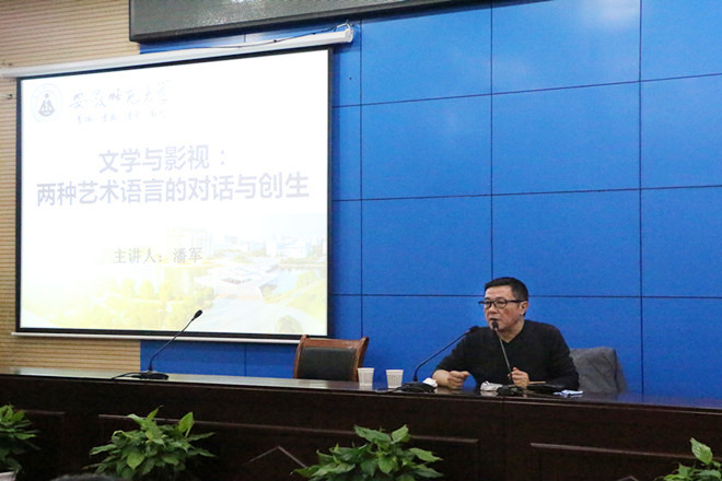 潘军老师从自身的写作历程谈起,讲述文学创作的苦与乐,诉说自己执着的作家梦和导演梦。小说《重瞳》创作时,一百多个夏夜的苦中作乐,给他带来无以言喻的写作幸福感;幼时戏台下的耳濡目染,为日后影视的编导工作打下了基础。当谈到先锋小说的发展以及当代文学的发展背景时,他说,“从文学的黄金时代到独自跳舞而无人喝彩的境地,文学已成为我日常生活、身体的一部分。”潘老师认为作家应该靠作品说话。身为作家,他认为真正的作家写作不为功利世俗,不会想拥有明星效应,像陈寅恪先生所说拥有“独立之精神,自由之思想”。在提及影视编导时,潘老师以电影《蓝白红》三部曲和《通天塔》为例,指出艺术无国界,对文艺作品的改编不是简单的图文转换,一个剧本的严密性需要从价值观到逻辑层面由上至下的正确性来保证。对于文学作品的银屏改编,潘老师表示真正一流的文学作品是无法被改编的,因为文学是“语言的艺术”,而影视需将其具象化。文学与影视可以相互学习,潘老师指出,两者的共同点是都要“说一个故事,说好一个故事”,并为大家生动演述了他的原创电影剧本《草桥的杏》,带给同学们震撼与感动。最后,潘老师希望同学们多读书观影,揣摩思考,坚持自己的价值观和理念,用一颗纯真的心去热爱艺术。讲座结束后,潘老师与同学们展开精彩互动,亲切地与同学们交流思想,悉心为大家解答疑惑。