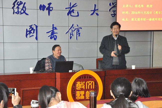 本网讯(图书馆)11月20日下午,敬文讲坛2016年第七讲(总第92讲)在敬文图书馆视听阅览室如期开讲。本次讲坛邀请到中国人民大学教授,博士生导师,中国现当代文学研究会副会长程光炜做了题为“贾平凹序跋文谈中的‘商州’”的专题讲座。讲座由文学院教授、博士生导师方维保主持,文学院部分教师、芜湖市陈东吉等作家和200多名本科生、研究生到场聆听。