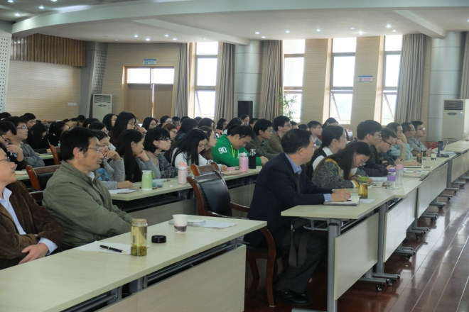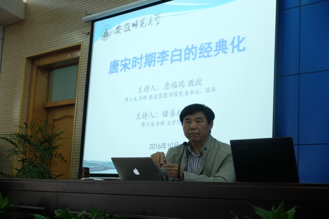 本网讯 (文学院 徐炜红)聆听名师教诲,创新学术思维。10月24日下午,博士生导师、原国家图书馆党委书记、馆长詹福瑞教授在花津校区圆形报告厅二楼应邀作“唐宋时期李白的经典化”学术讲座。校研究生院院长、党委研工部部长胡传志教授,文学院副院长王昊教授,以及文学院各专业研究生导师、全体研究生出席此次讲座。讲座由博士生导师、文学院院长储泰松教授主持。