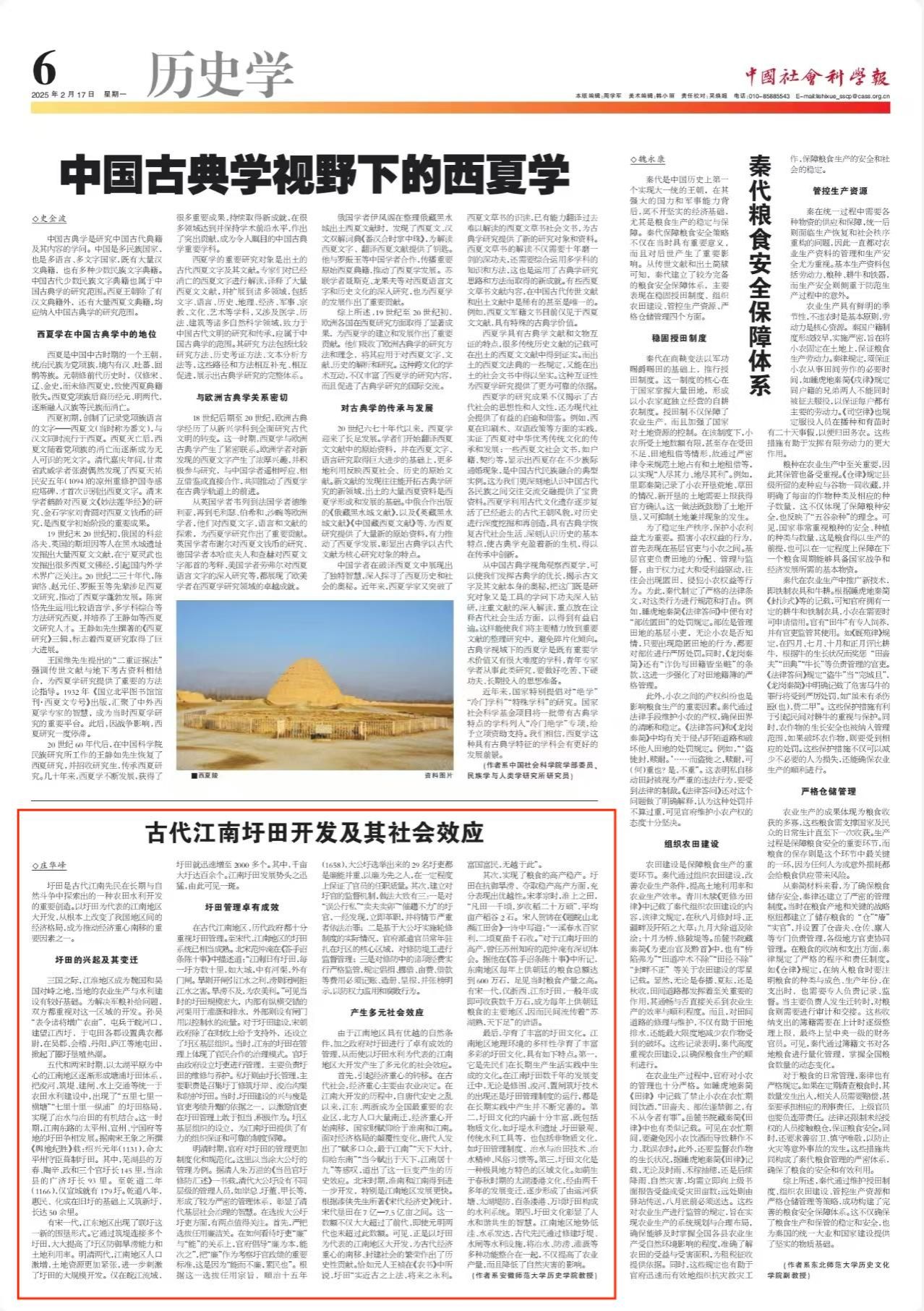2月17日,《中国社会科学报》第6版“历史学”刊发了我校历史学院庄华峰教授题为《古代江南圩田开发及其社会效应》的理论文章。文章从“圩田的兴起及其变迁”“圩田管理卓有成效”“产生多元社会效应”三个方面阐述了古代江南圩田开发的历程及其在改变我国地区间的经济格局、促进经济重心南移方面的重要推动作用。现将全文转录如下: