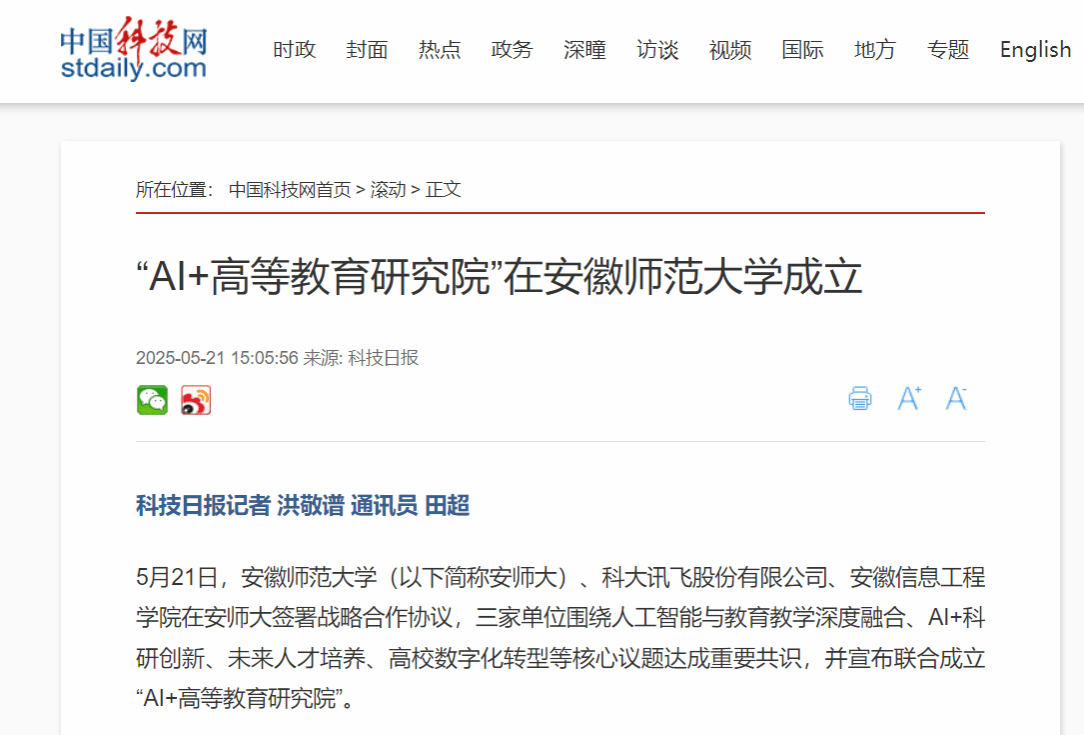 5月21日,安徽师范大学(以下简称安师大)、科大讯飞股份有限公司、安徽信息工程学院在安师大签署战略合作协议,三家单位围绕人工智能与教育教学深度融合、AI+科研创新、未来人才培养、高校数字化转型等核心议题达成重要共识,并宣布联合成立“AI+高等教育研究院”。