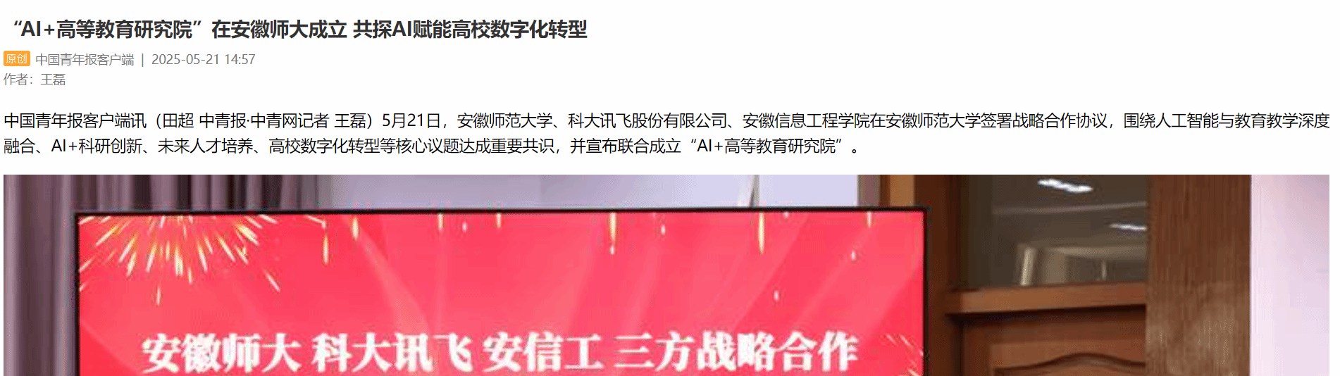 5月21日,安徽师范大学、科大讯飞股份有限公司、安徽信息工程学院在安徽师范大学签署战略合作协议,围绕人工智能与教育教学深度融合、AI+科研创新、未来人才培养、高校数字化转型等核心议题达成重要共识,并宣布联合成立“AI+高等教育研究院”。