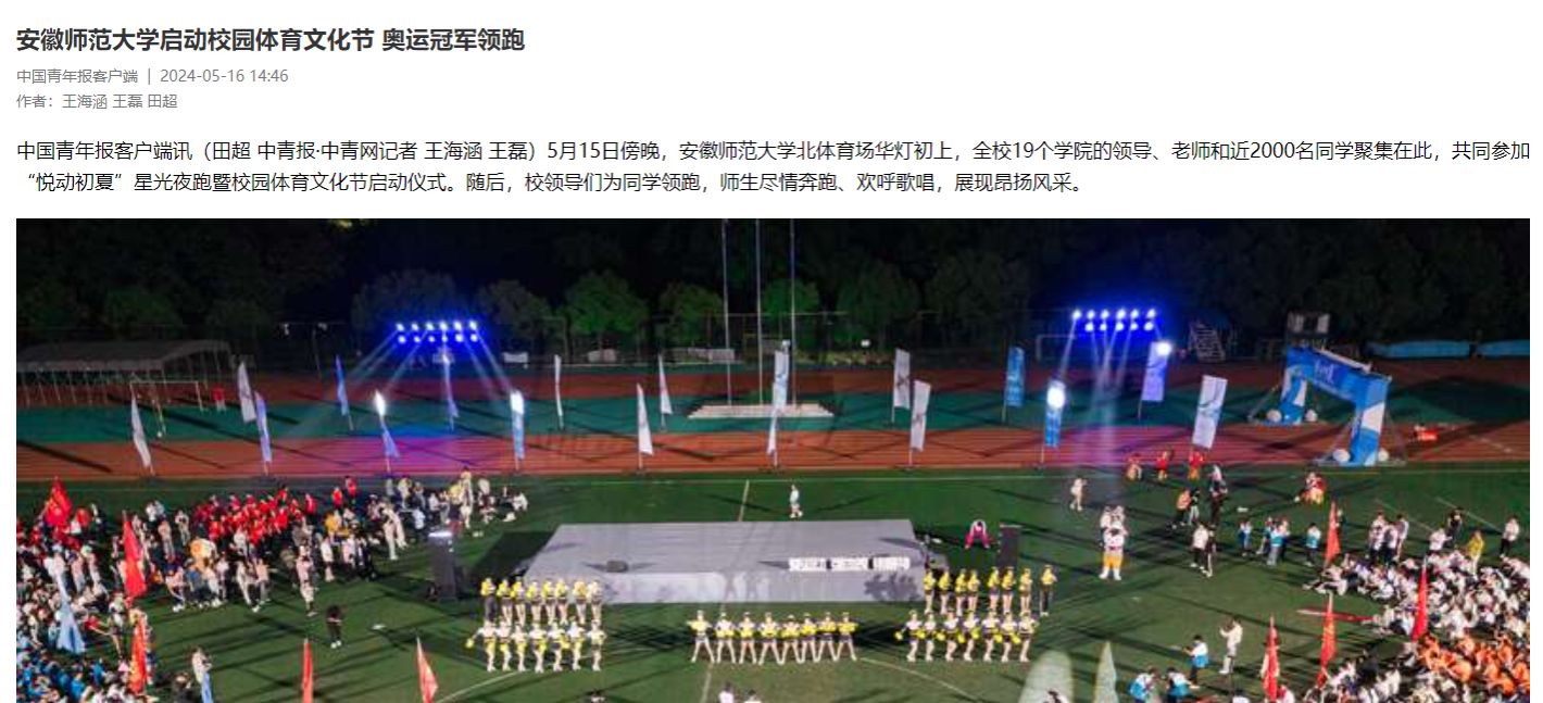 中国青年报客户端讯(田超 中青报·中青网记者 王海涵 王磊)5月15日傍晚,安徽师范大学北体育场华灯初上,全校19个学院的领导、老师和近2000名同学聚集在此,共同参加“悦动初夏”星光夜跑暨校园体育文化节启动仪式。随后,校领导们为同学领跑,师生尽情奔跑、欢呼歌唱,展现昂扬风采。