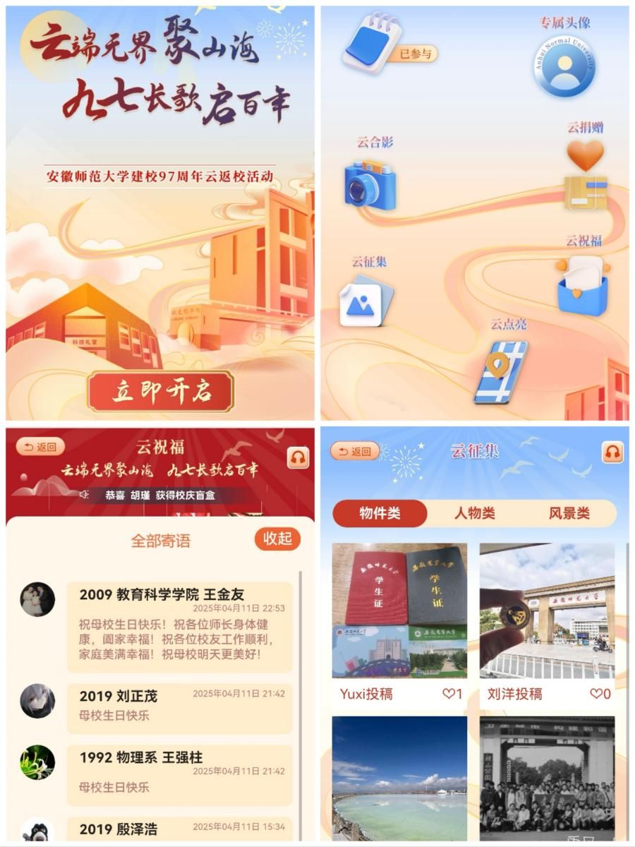 4月10日,“云端无界聚山海,九七长歌启百年”云返校活动在校友综合管理服务线上平台与校友准时见面,校友办热情邀请全体师生、海内外校友及所有关注并支持学校发展的朋友们云端相聚,共同为安徽师大97周年华诞发送祝福。此次云端活动共设计了包括“云报到”“专属头像”“云合影”“云祝福”“云征集”“云点亮”和“云捐赠”等在内的七大模块线上活动,累计有22642人次校友参与了云校庆活动,他们以多种方式向母校表达爱意与祝福。