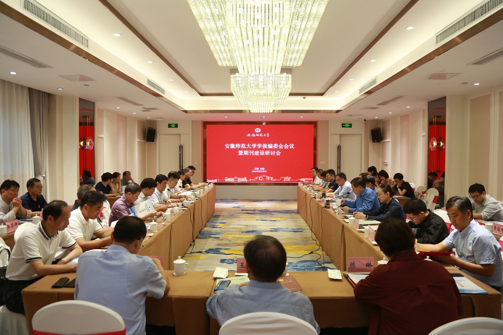 为加快推进期刊高质量发展,建设高水平、专业化编委队伍,切实发挥编委会的学术引领、指导和咨询作用,9月29日,安徽师范大学学报编辑部主办的安徽师范大学学报编委会会议暨期刊建设研讨会在我校召开。中山大学学报主编彭玉平教授,四川大学讲席教授徐泽水,北京师范大学学报主编郭家宏教授,人大复印资料副总编钱蓉编审,同济大学陈立新教授,上海师范大学期刊社社长洪庆明教授,中国科学技术大学学报编辑部副主任李玉红教授,杭州电子科大任一支教授,中国科学技术大学丁冬生教授等专家学者到会。校党委副书记、常务副校长熊宇杰,校党委常委、副校长高峰,学术副校长辛涛及文理科学报校内编委、学报编辑部全体成员共50余人参加会议。会议由高峰主持。