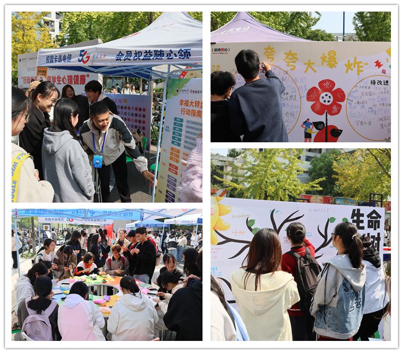校级活动由“紫薇园”学生心理健康教育中心联合各学院发展辅导站策划组织,10月23日在现场共设22个展区、39项活动,通过心理知识主题展板、宣传册、互动游戏等形式传播心理健康知识,帮助同学们缓解压力、放松心情。同学们在“幸福大转盘”“情绪交换盲盒”活动中积累积极情绪、体验幸福;在“夸夸大爆炸”“心灵破茧”活动中认识自我、肯定自我;在“扎染生花”“年轮印记”活动中领悟文化、丰润心灵;在“以叶作画,共绘花津”“生命之树”活动中感悟生命、守护生命;在“词汇接龙”“数字练练看”“‘码’动未来”活动中碰撞思维、锻炼逻辑;在“指纹DIY”“千千心语”活动中绘说心声、展望未来。学院和班级也结合自身专业特点等开展心理知识普及、心理素质拓展、心理朋辈帮扶、心理祝福分享等丰富多彩的主题活动。