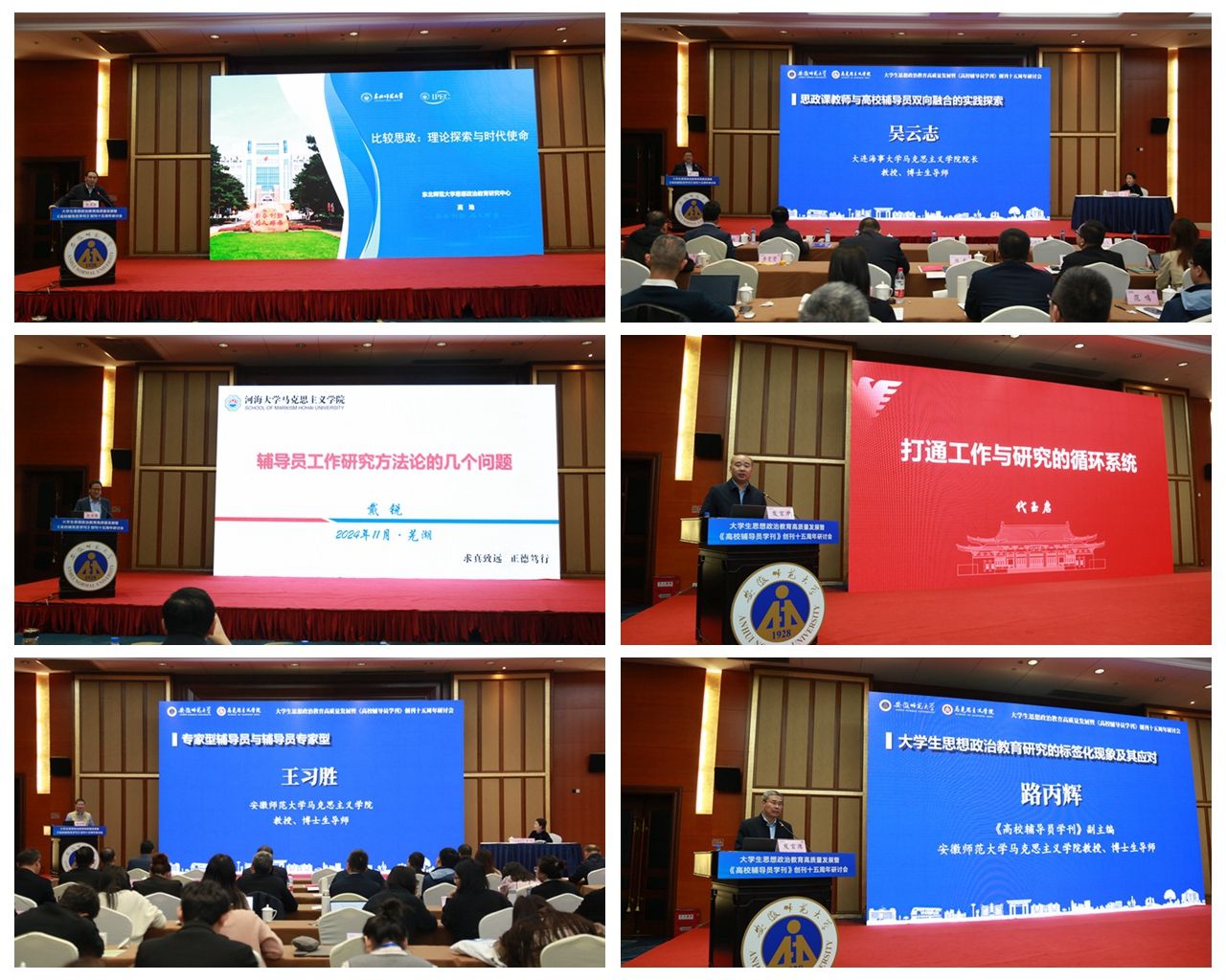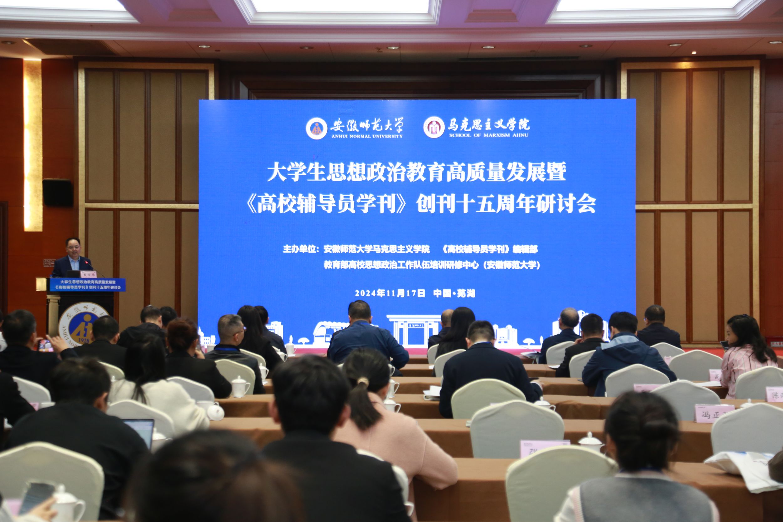 为深入学习贯彻习近平新时代中国特色社会主义思想和党的二十届三中全会精神,纪念《高校辅导员学刊》创刊十五周年,2024年11月17日,由《高校辅导员学刊》编辑部、马克思主义学院、教育部高校思想政治工作队伍培训和研修中心(安徽师范大学)主办的大学生思想政治教育高质量发展暨《高校辅导员学刊》创刊十五周年研讨会在我校召开。来自中国人民大学、北京科技大学、浙江大学、东北师范大学、河海大学、同济大学等国内70余所高校以及《马克思主义理论学科研究》《思想教育研究》《思想政治教育研究》《思想战线》《学校党建与思想教育》《高校辅导员》等兄弟刊物的130多名专家学者参加了本次会议。开幕式由《高校辅导员学刊》编辑部主任、马克思主义学院院长、教育部高校思想政治工作队伍培训和研修中心(安徽师范大学)管委会办公室主任姚宏志教授主持。