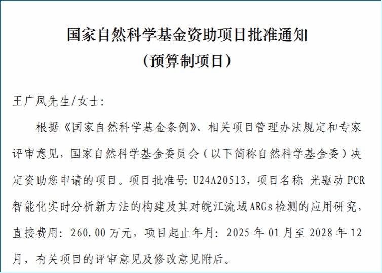 近日,国家自然科学基金委公布了2024年度国家自然基金区域创新发展联合基金项目评审结果,我校化学与材料科学学院王广凤教授申报的“光驱动PCR智能化实时分析新方法的构建及其对皖江流域ARGs检测的应用研究”项目获批立项。这是我校首次承担国家自然科学基金联合基金重点项目。