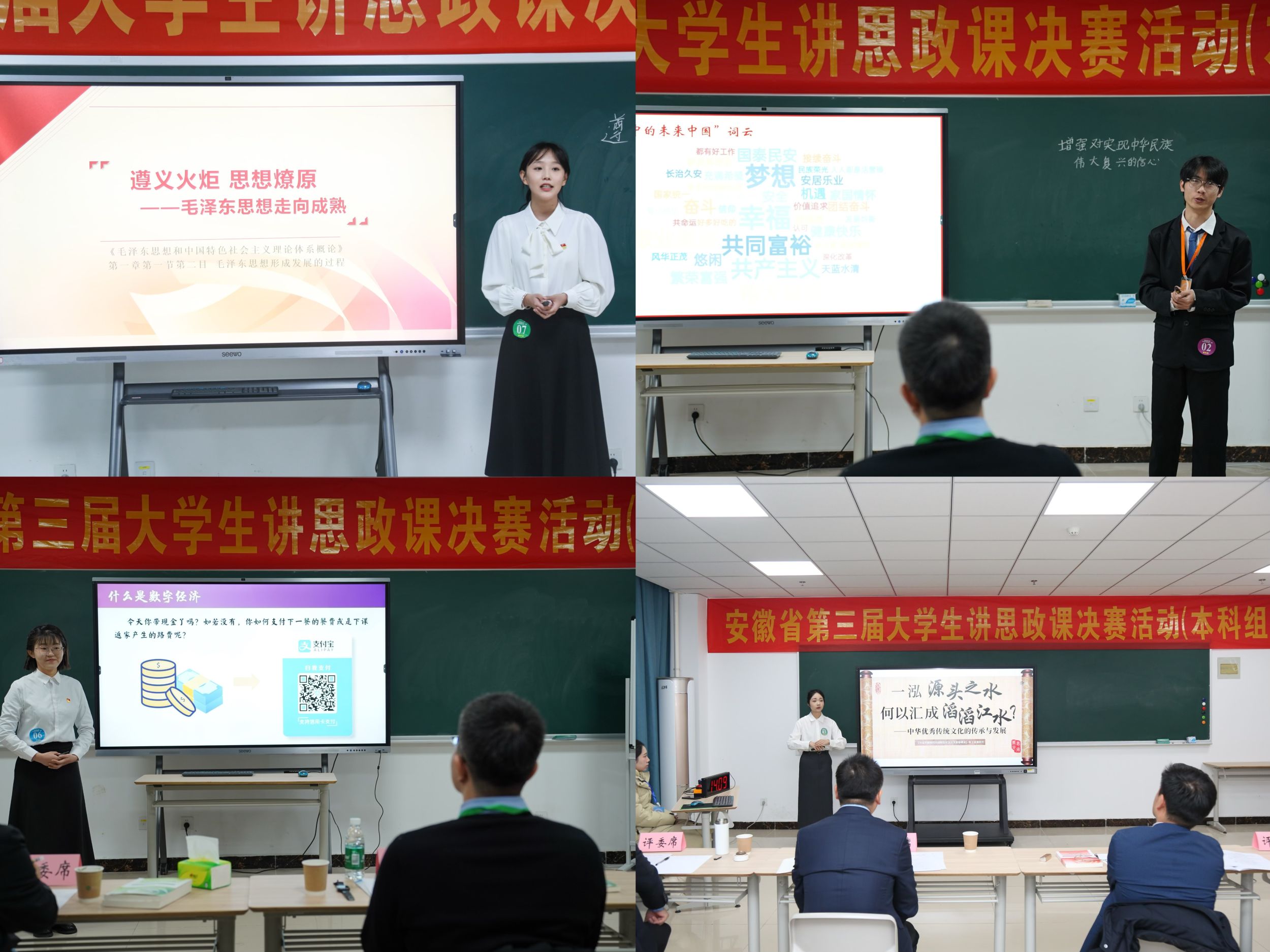 为深入学习贯彻习近平总书记对学校思政课建设的重要讲话和重要指示批示精神,全面落实新时代学校思政课建设推进会精神,深化思政课改革创新,12月25日,由中共安徽省委教育工委主办,教育部高校思想政治工作队伍培训研修中心(安徽师范大学)、安徽师范大学马克思主义学院承办的安徽省第三届大学生讲思政课决赛在我校举行。来自全省30所本科院校、45支参赛队伍参加决赛。经过激烈角逐,本次比赛共产生特等奖6名、一等奖8名、二等奖13名和三等奖18名。我校马克思主义学院李艾同学斩获特等奖,音乐学院王睿仪同学斩获一等奖。