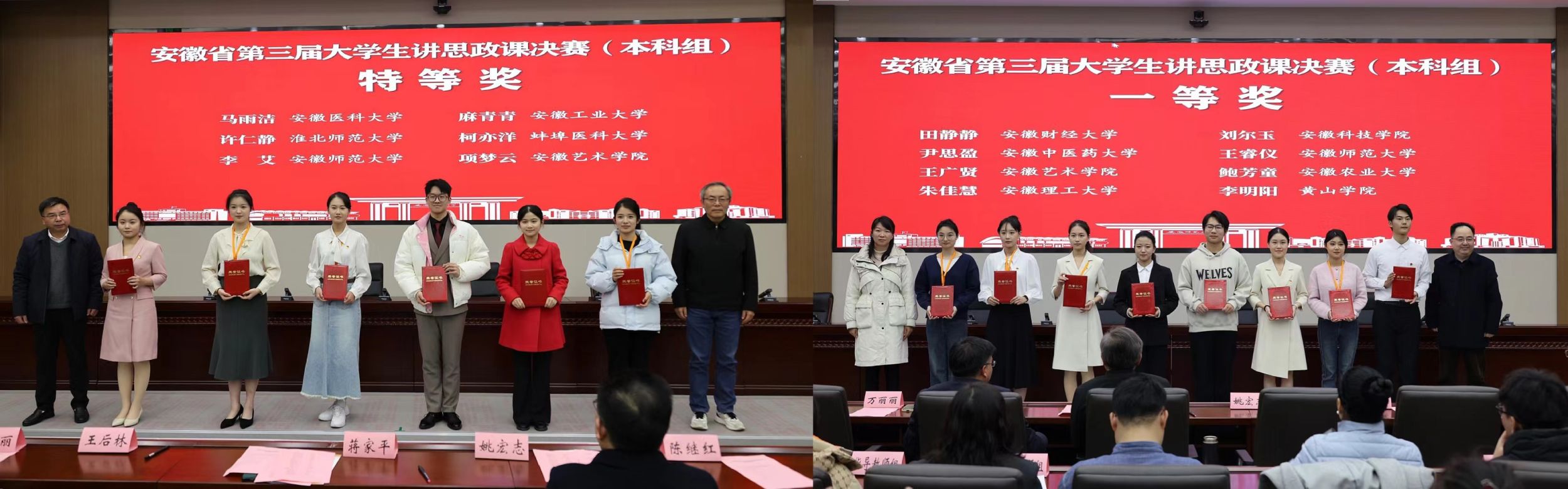 近日,安徽省第三届大学生讲思政课活动决赛在安徽师范大学举行,来自全省30所本科院校的45支参赛队伍参加。我校学子在比赛中展现出卓越的风采和深厚的思政素养。最终马克思主义学院李艾同学在思政课教师牛菲、孙艳秋指导下荣获特等奖,音乐学院王睿仪同学在思政课教师沈燕培指导下荣获一等奖。