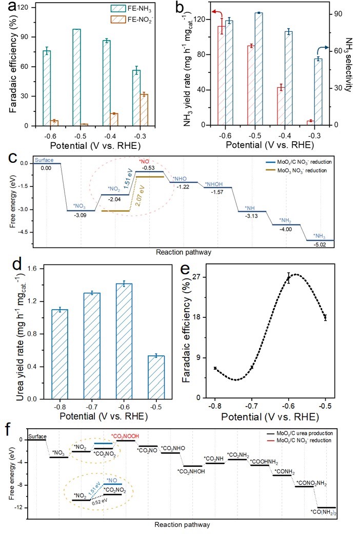 MoOx/C催化剂在NO3-还原中具有98.14 %的优异法拉第效率(FE)和91.63 mg h-1mgcat.-1的NH3产率。此外,在NO3-/CO2共还原合成尿素中,最高FE为27.7 %,最大尿素产率能够达到1431.5 μg h-1mgcat.-1。通过一系列的控制实验和DFT理论计算结果表明,MoOx/C催化剂的高活性得益于负载型小尺寸团簇独特的电子结构,暴露了更多不饱和的富电子位点,能够增强其与含N、C反应物以及中间体之间的电子转移,有利于吸附和活化过程的进行,有效稳定了*NO和*CO2NOOH关键中间体,促进NH3和urea的生成。