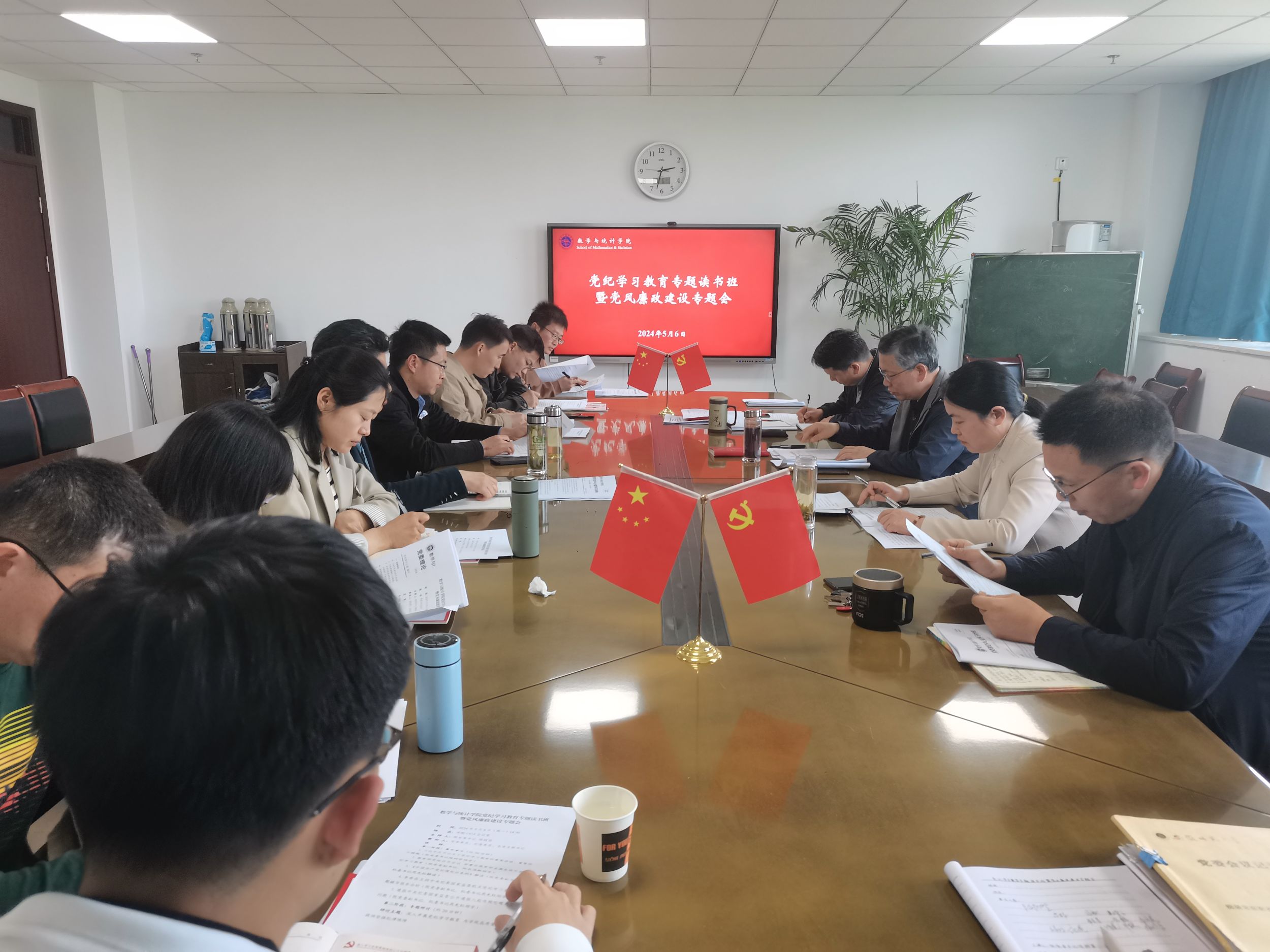 5月6日下午,数学与统计学院党纪学习教育读书班暨党风廉政专题会在文典楼C410会议室举行,深入学习习近平总书记关于党纪学习教育的重要讲话和重要指示精神,解读《中国共产党纪律处分条例》,开展警示教育,进行主题研讨,认真贯彻落实省委和学校工作要求,示范带动学院党纪学习教育扎实开展。学院领导班子、党委委员、纪委委员、师生党支部书记参加会议。会议由院党委书记陈树贤主持。