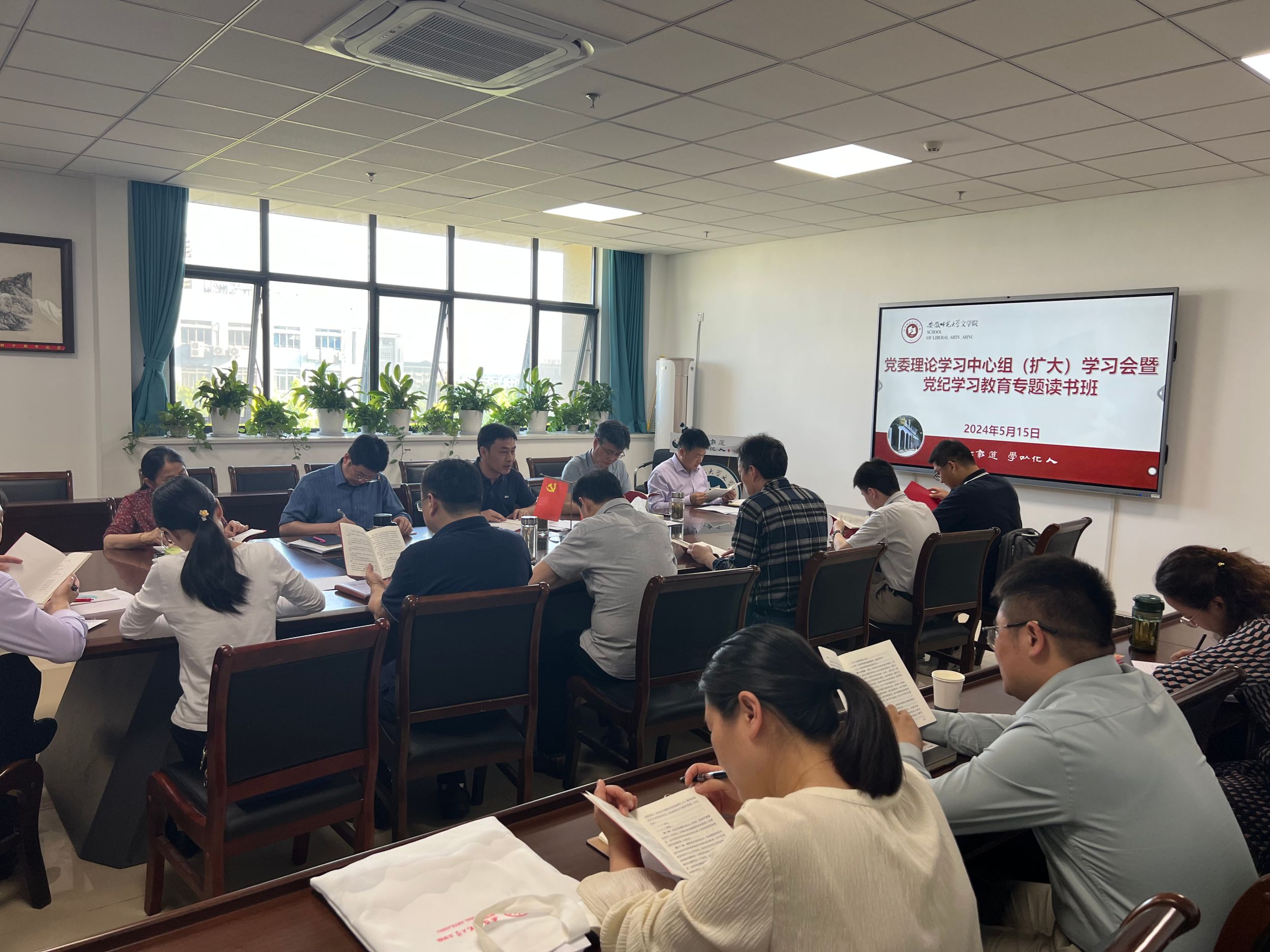 为深入学习贯彻习近平总书记关于党纪学习教育的重要讲话和重要指示精神,5月15日下午,文学院召开党委理论学习中心组(扩大)学习会暨党纪学习教育专题读书班(第一期),专题学习《中国共产党纪律处分条例》。会议由学院党委副书记(主持党委工作)戴和圣主持,学院处级党员领导干部、党委委员、纪委委员和各党支部书记参加会议。