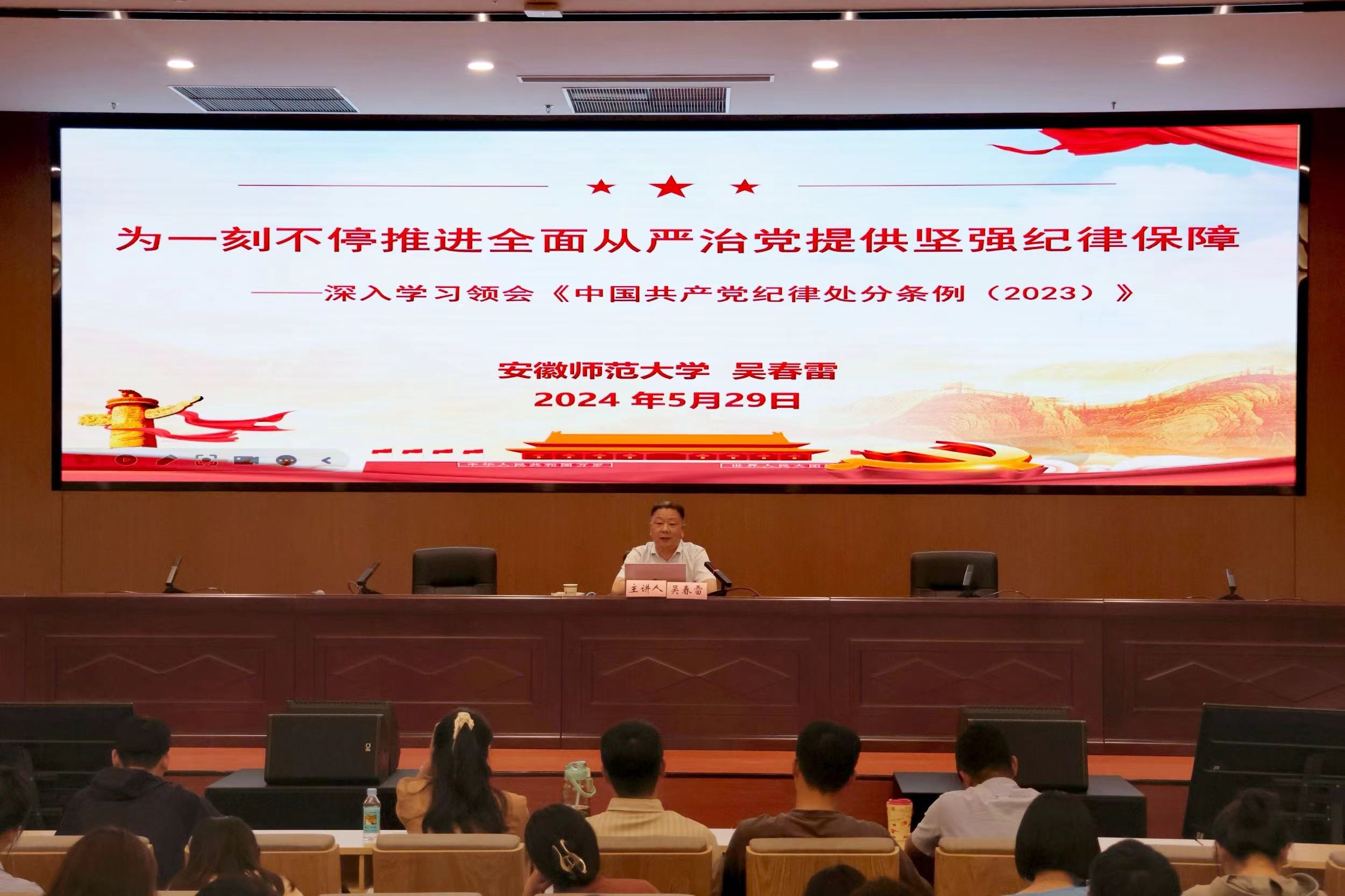 讲座中,吴春雷从为什么要修订《条例》、新《条例》修订的主要内容、反腐败斗争怎么看怎么办等三个方面解读了《中国共产党纪律处分条例》。他带领辅导员学习了习近平总书记关于党的纪律建设的重要讲话精神,回顾了《中国共产党纪律处分条例》的修订和发展过程,强调党中央通过不断完善纪律规矩彰显推进自我革命的坚定决心和坚强意志。吴春雷重点讲解了《条例》修订的主要内容,结合大量具体鲜活的案例,强调指出党中央通过明确纪律处分的内容和程序强化对违纪行为的惩处力度,从而严格规范党员行为、维护党的纪律,推动党的建设向更高标准更严要求迈进。