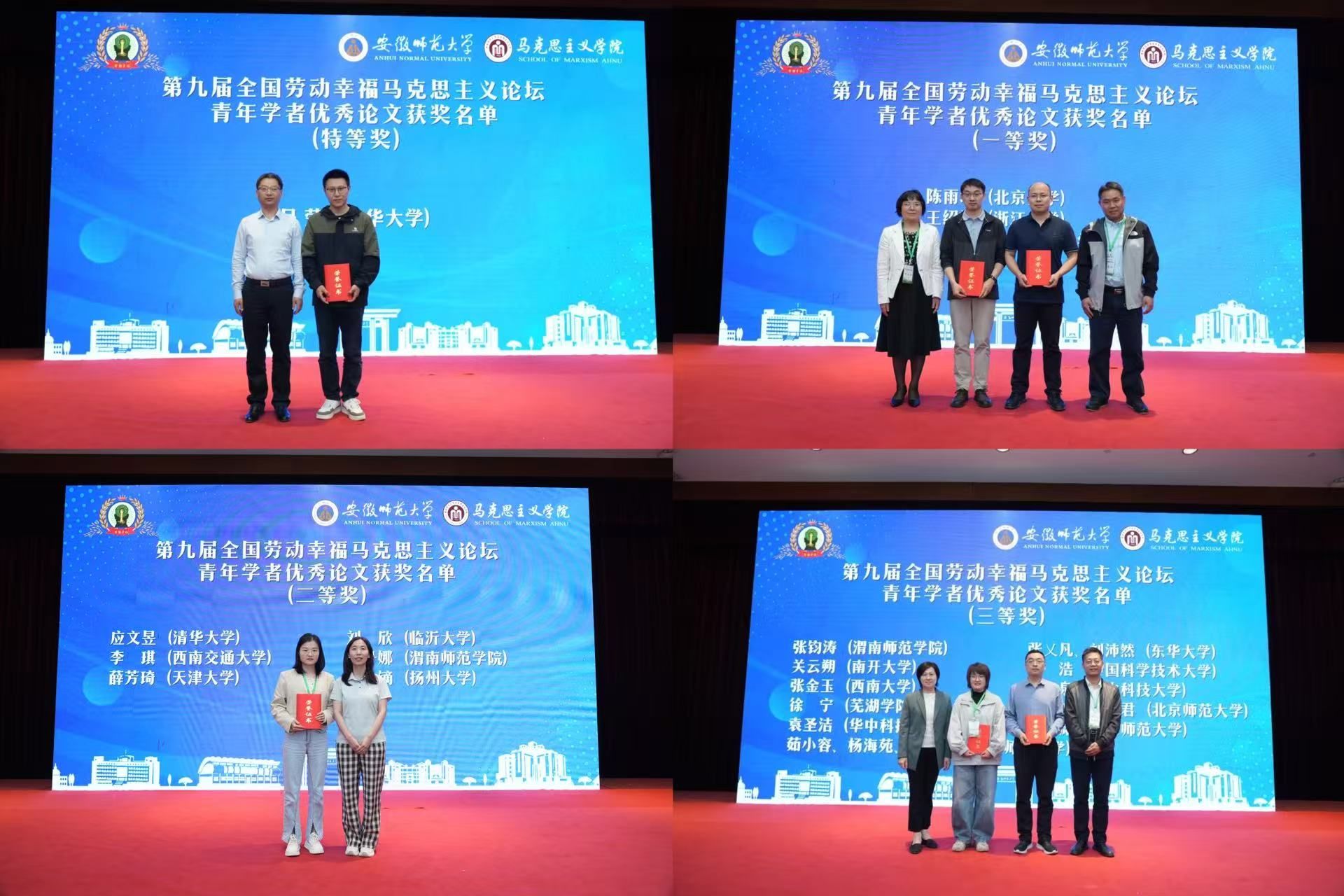 论坛闭幕式由合肥工业大学马克思主义学院唐莉教授主持。闭幕式第一个环节由东华大学马克思主义学院吴荣老师、上海出版印刷高等专科学校马克思主义学院副教授王永秋、临沂大学刘欣老师、浙江大学马克思主义学院王绍梁老师代表各分论坛进行了总结汇报。闭幕式第二个环节,东华大学马克思主义学院副教授张乂凡宣读获奖名单。本届论坛经专家组匿名评审,评选出特等奖1名,一等奖3名,二等奖6名,三等奖10名,优秀奖11名。安徽师范大学马克思主义学院副院长汪盛玉、安徽师范大学马克思主义学院副院长赵冰、上海旅游高等专科学校马克思主义学院院长周利方、上海商学院马克思主义学院副院长沈全、上海城建职业学院马克思主义学院书记刘严宁、山西师范大学贾蕾老师分别给获奖者代表颁奖并合影留念。闭幕式第三个环节,汪盛玉致闭幕词与宣布论坛闭幕。她指出此次论坛共有60多位专家学者代表发言、13家期刊、出版社为读者、作者答疑解惑,这是一场以“劳动幸福·美好生活·中国式现代化”为主题的文化盛会。最后,她代表主办方对承办方以及所有与会专家表达感谢,也对会务组成员的辛勤服务表达谢意。