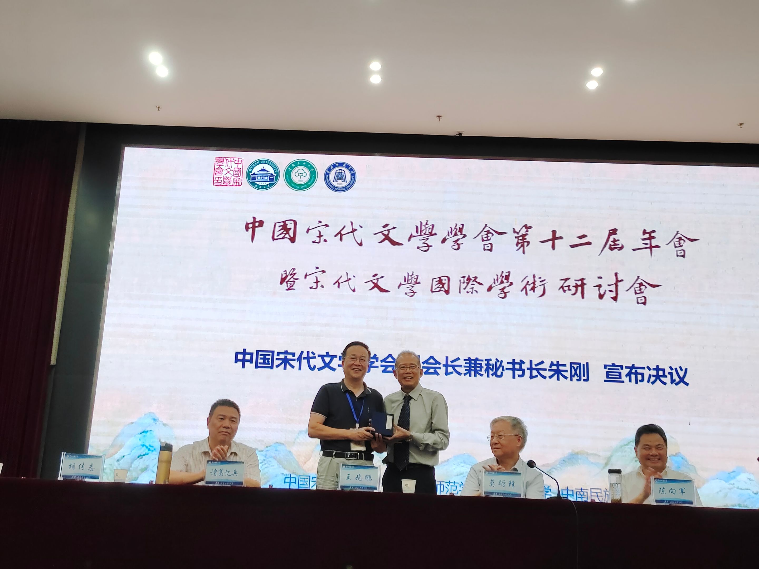 本次会议的一大创获是胡传志教授当选中国宋代文学学会副会长,我校被确立为下一届宋代文学学会承办单位。在闭幕式上,胡传志副会长从新晋宋代文学学会会长四川大学王兆鹏教授手中接过学会印章并发言。他向学会对安徽师范大学中国诗学研究中心的信任表示感谢,一定按照学会的部署和要求,扎实做好会议筹备工作,努力将会议办好,热烈欢迎与会同仁到芜湖参会交流。莫砺锋教授指出,宋代文学的学术研究对于现代文明建设及中华文明现代传承的重要价值,作为宋代文化重要板块的宋代文学,更是如此。安徽师范大学中国诗学研究中心承办下届宋代文学学会年会,必将推动宋代文学和文化研究,有助于地域间文化交流,推进文化遗产发掘,助力文旅资源建设,发挥良好的社会效益。