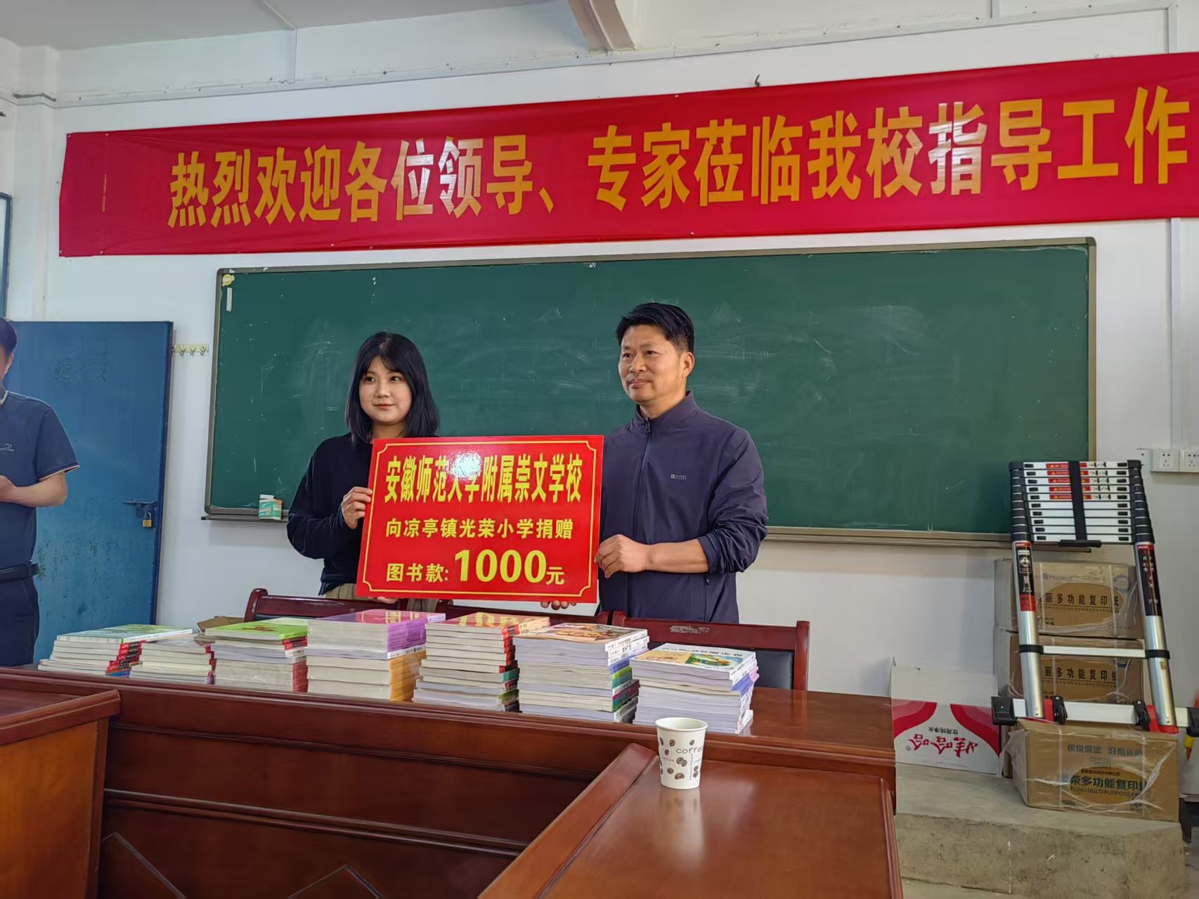 4月26日,“关爱乡村儿童,传递爱心阅读”图书捐赠仪式在凉亭镇光荣小学举行。本次活动的爱心捐赠款来自安徽师范大学附属崇文学校全校师生开展的小商品爱心义卖活动。本次爱心捐赠活动向凉亭镇光荣小学捐赠了图书一百本。捐赠的图书内容广泛,涵盖了整本书阅读、儿童文学、公益环保、知识科普等多个类别,旨在满足小学生多样化的阅读需求,为他们打开知识的宝库,为乡村孩子送去优质的学习资源。此次捐赠活动,不仅是对乡村小学物资支持的实际举措,更是爱心传递与教育暖人心深度融合。